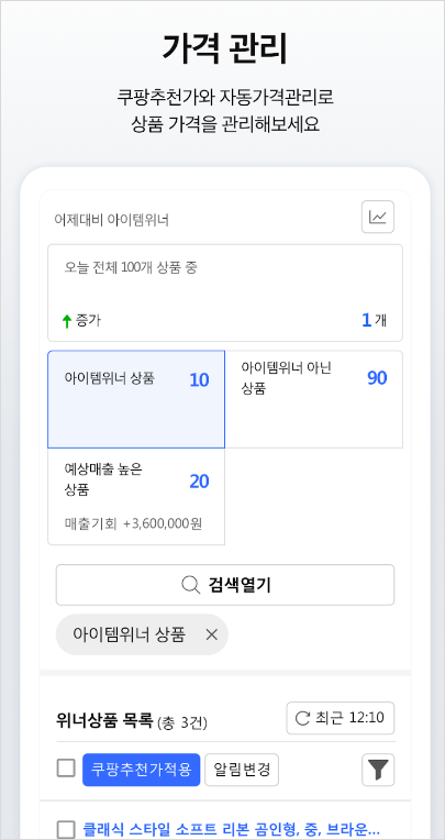 - 즉시 처리해야 할 일이 있다면, 윙 앱이 알려줍니다. 가격 관리 알람을 확인하고 신규 주문을 놓치지 마세요!